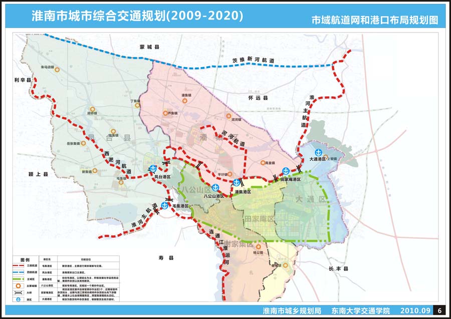 水路方面规划打通西淝河—淮河-瓦埠湖-江淮运河航道,打通泥河三级航道,提高茨淮新河等级至四级。规划毛集、凤台、八公山、潘集、田家庵、大通等六大港区。