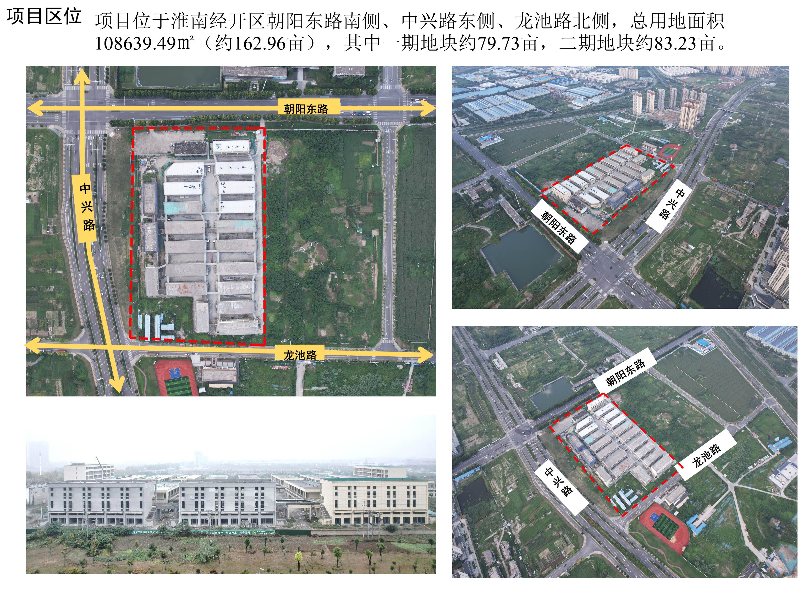 项目地块位于淮南经开区朝阳东路南侧、中兴路东侧、龙池路北侧,总用地面积108639.49㎡;其中原规划一期地块约79.73亩,二期地块约83.23亩。目前一期地块21栋建筑在建,剩余1#楼、39#楼及配电房待建。