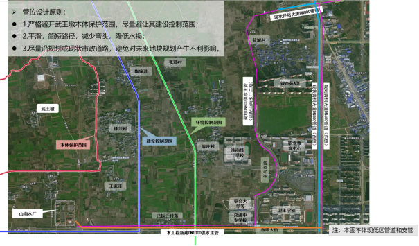 路线:自山南水厂出水泵房出厂区后,向东沿春申大街北侧规划绿带敷设至青桐大道,与青桐大道北侧现状DN800高区配水主管衔接。总长约5千米。