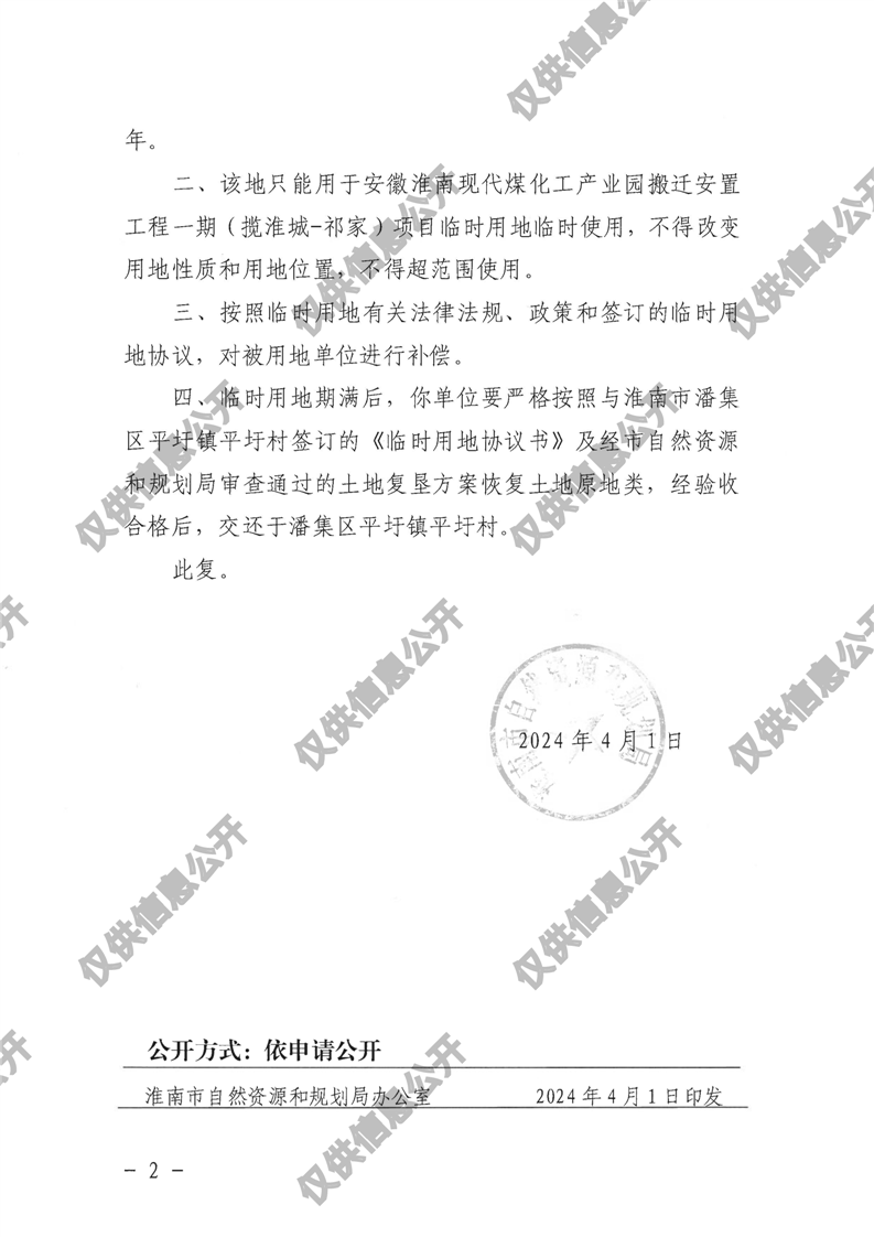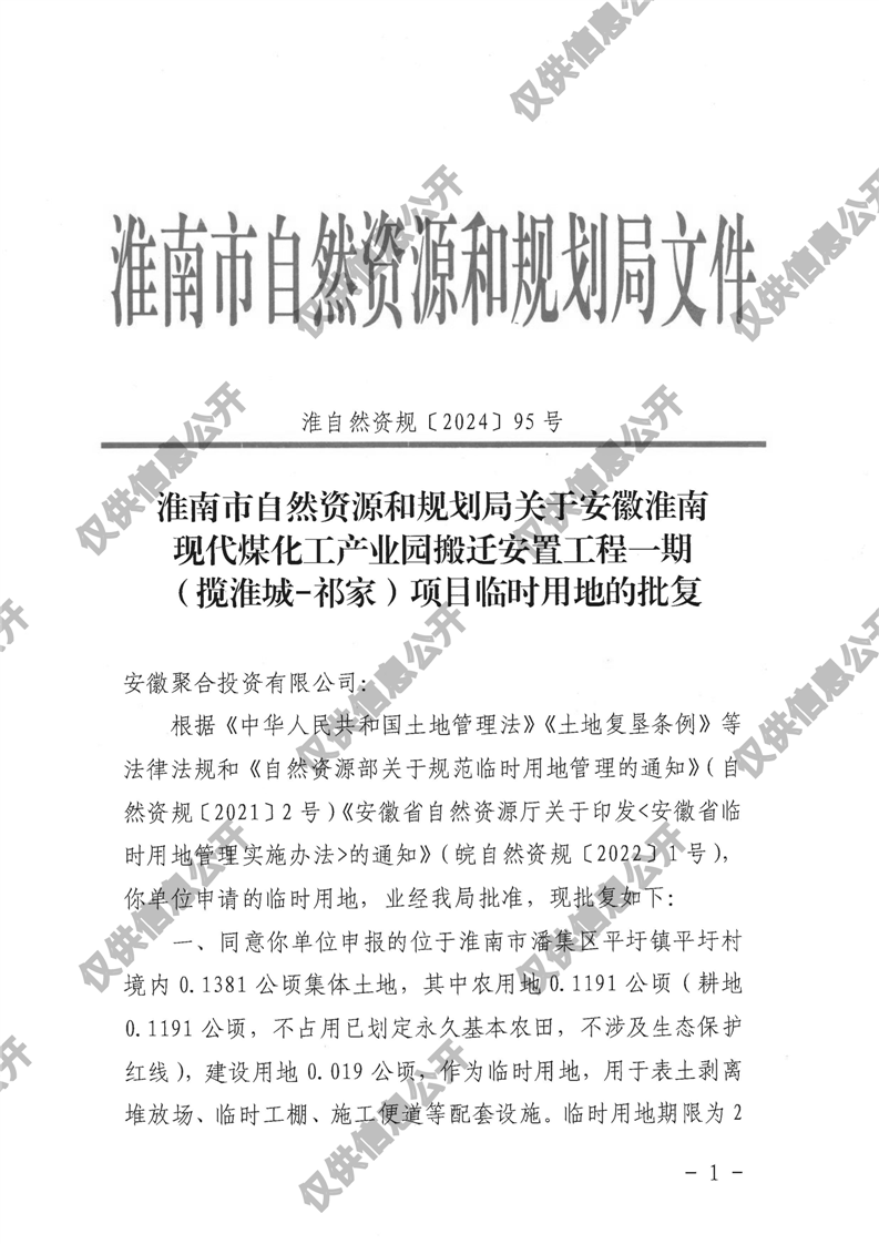 安徽淮南现代煤化工产业园搬迁安置工程一期(揽淮城-祁家)项目临时用地批复