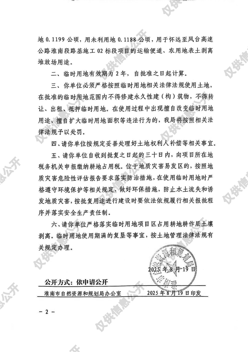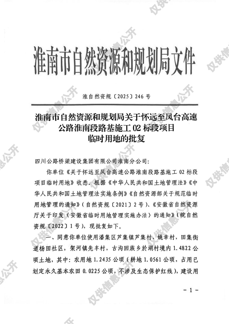 怀远至凤台高速公路淮南段路基施工02标段项目临时用地批复淮自然资规〔2025〕246号
