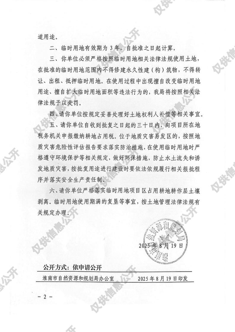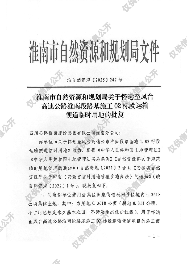 怀远至凤台高速公路淮南路基施工02标段运输便道项目临时用地批复淮自然资规〔2025〕247号