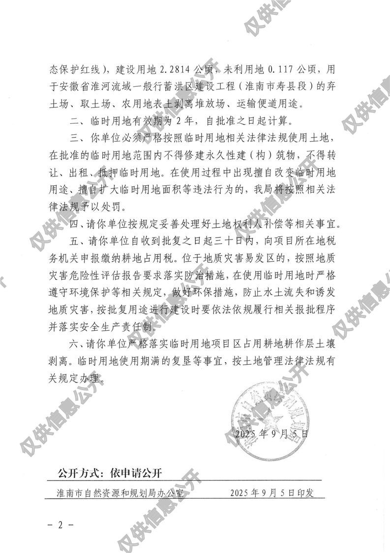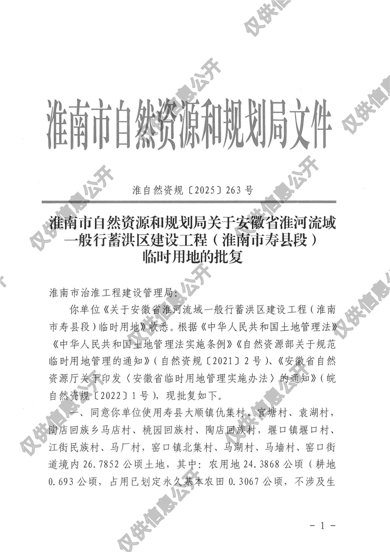 安徽省淮河流域一般行蓄洪区建设工程(淮南市寿县段)临时用地批复