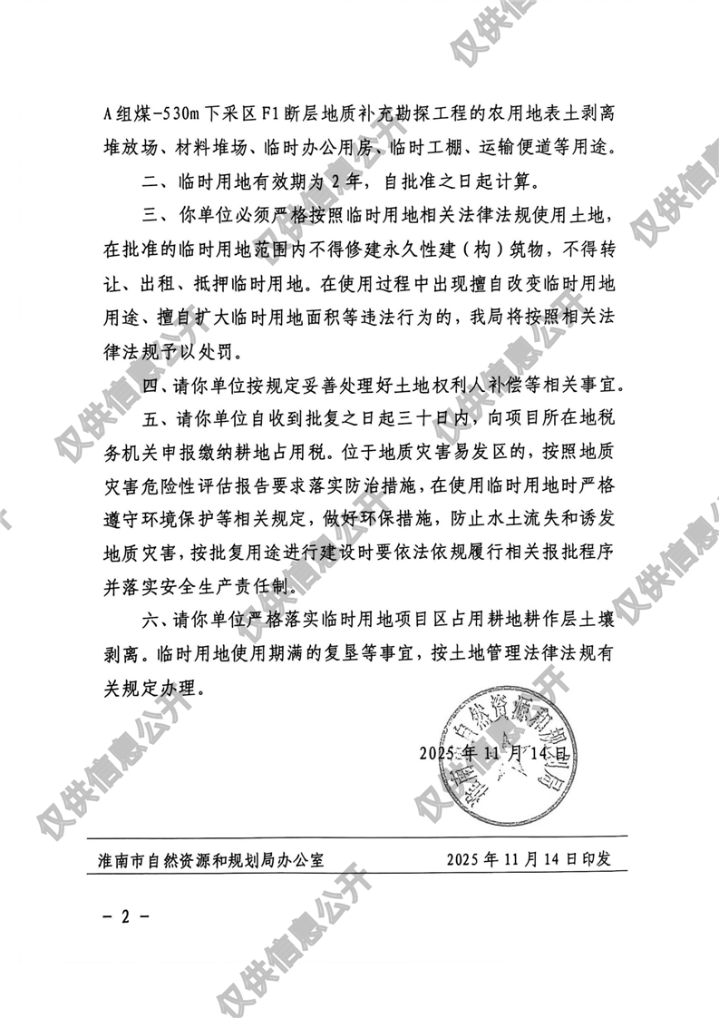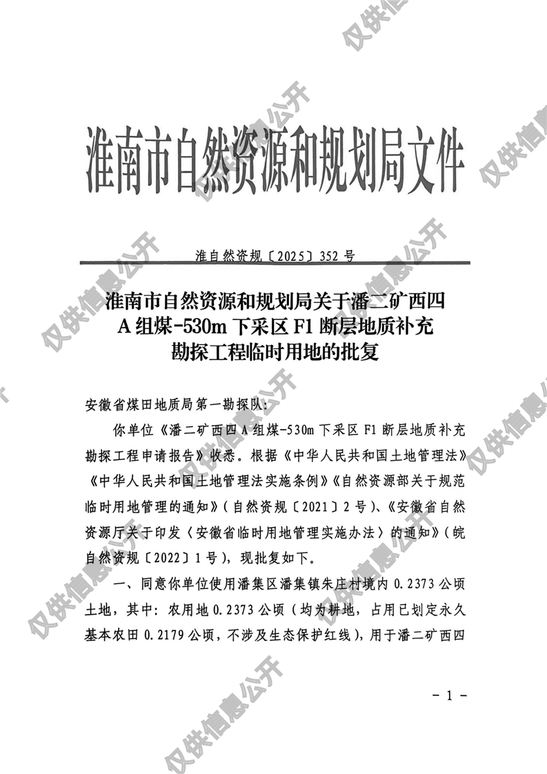 潘二矿西四A组煤-530m下采区F1断层地质补充勘探工程临时用地批复