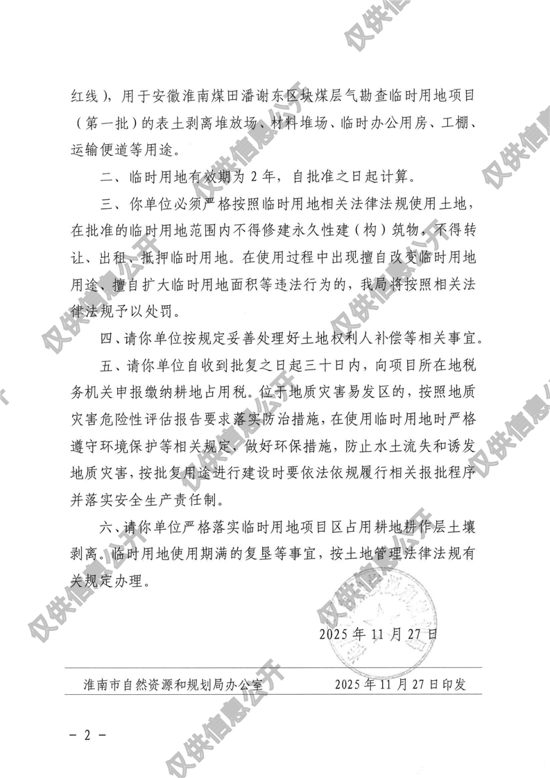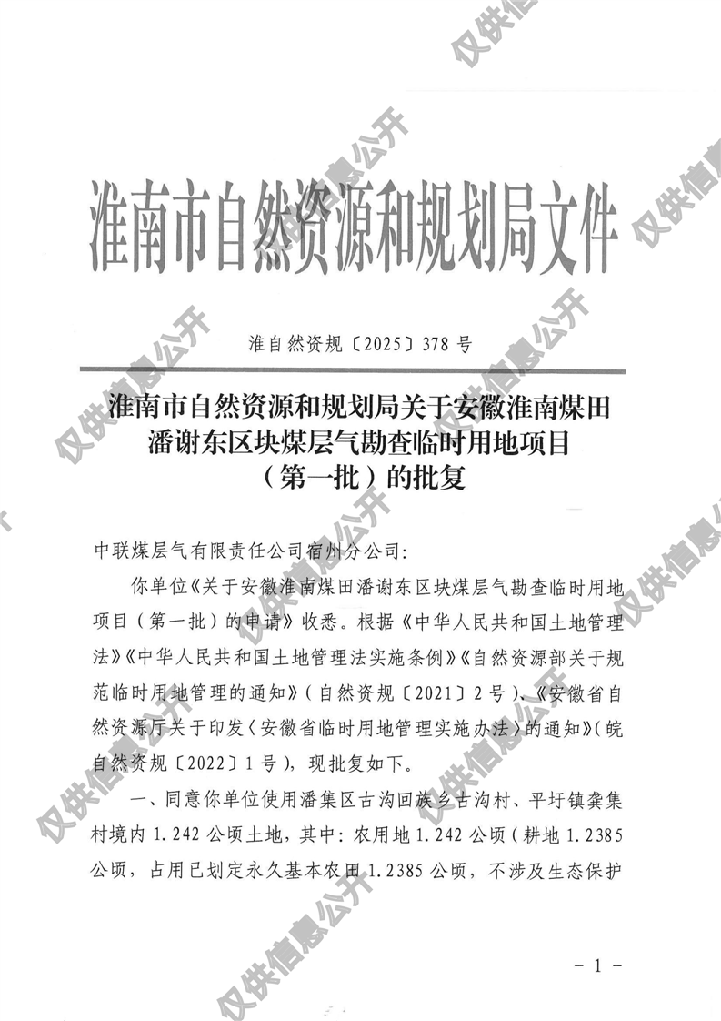 安徽淮南煤田潘谢东区块煤层气勘查临时用地项目(第一批)批复