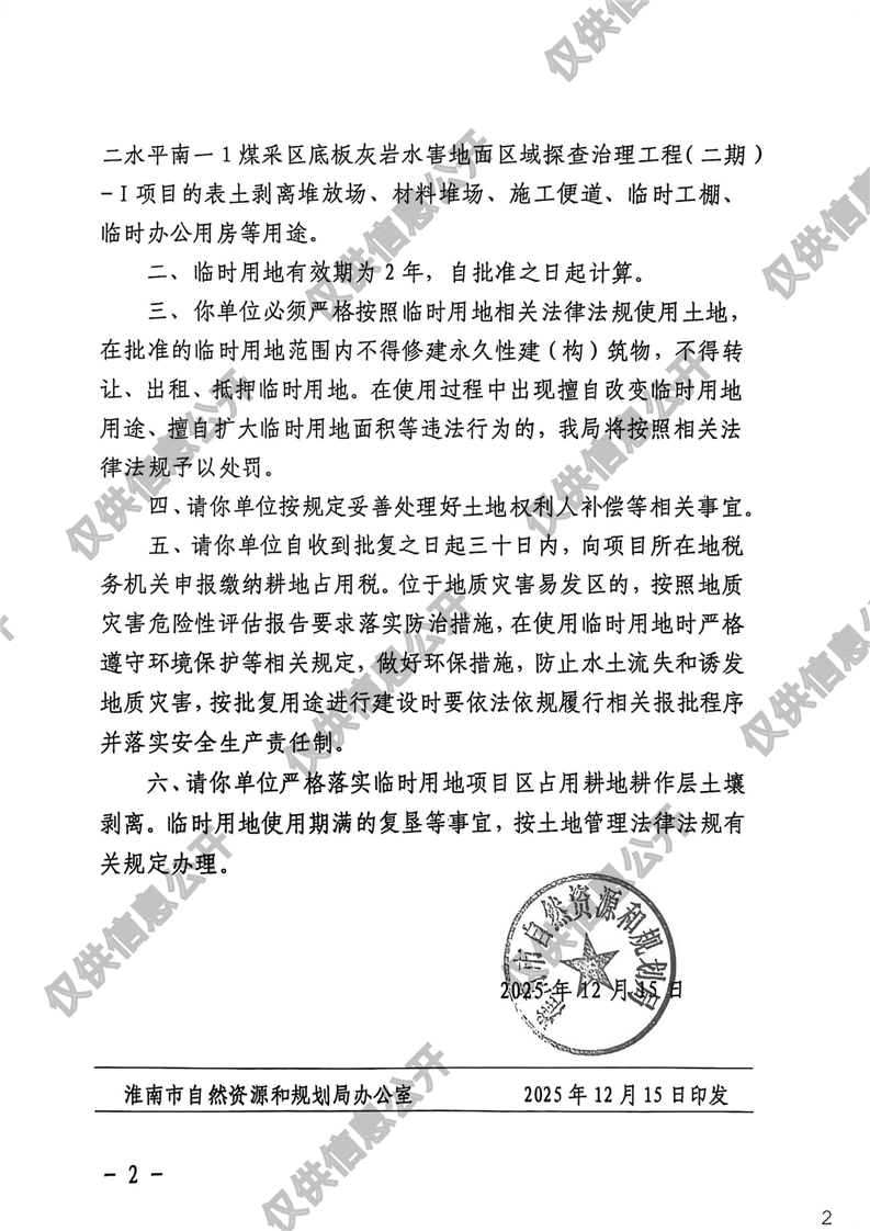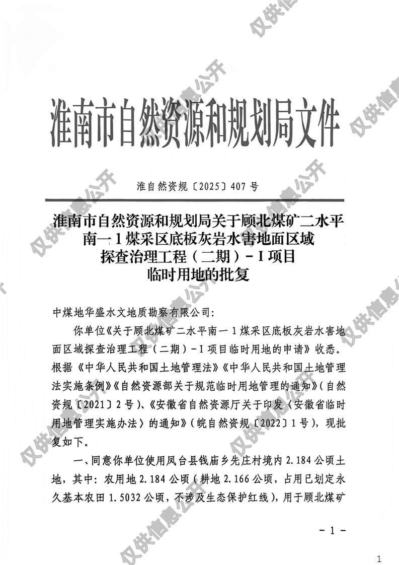 顾北煤矿二水平南-1煤采区底板灰岩水害地面区域探查治理工程(二期)-Ⅰ项目临时用地批复