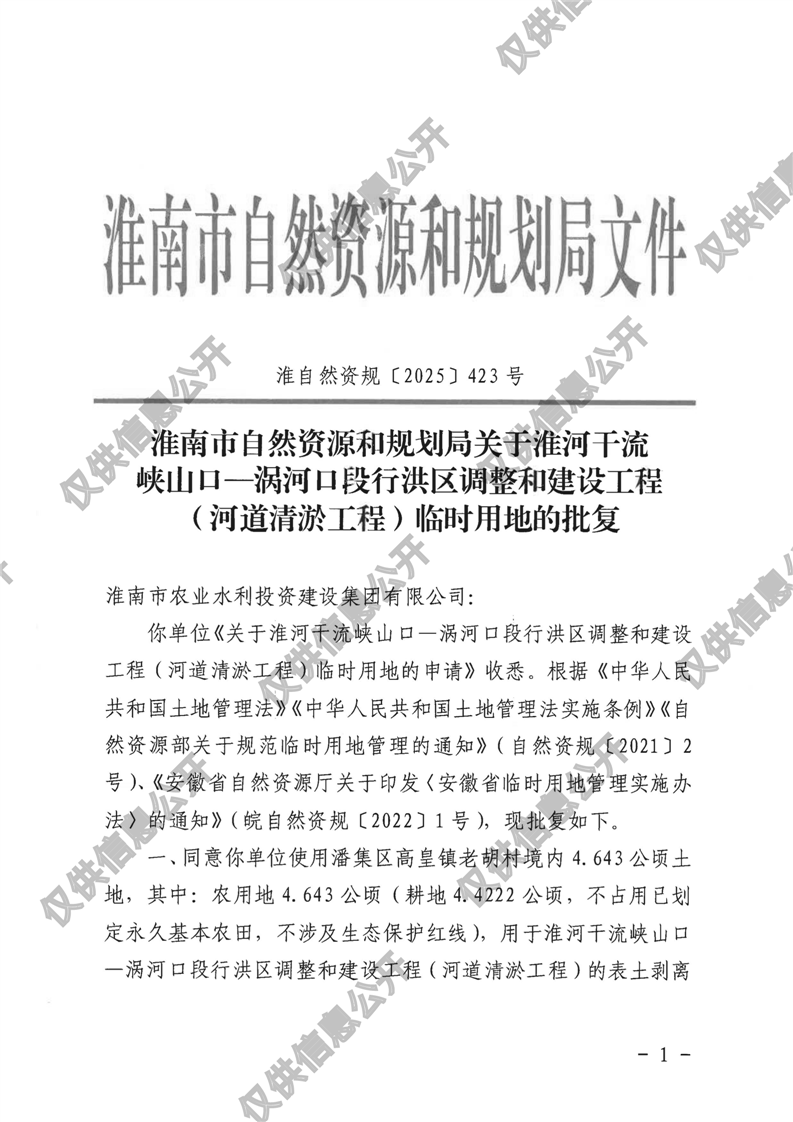 淮河干流峡山口—涡河口段行洪区调整和建设工程(河道清淤工程)临时用地的批复