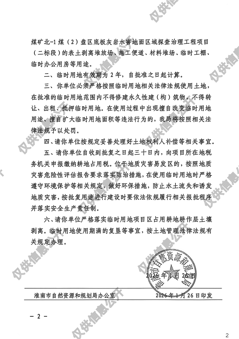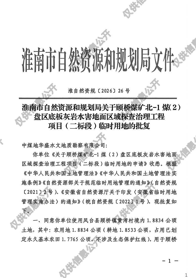 顾桥煤矿北-1煤(2)盘区底板灰岩水害地面区域探查治理工程项目(二标段)临时用地批复