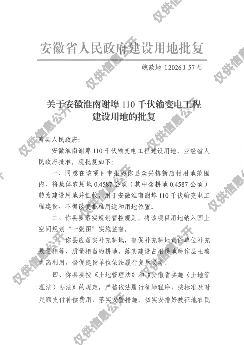 关于安徽淮南谢埠110千伏输变电工程建设用地的批复