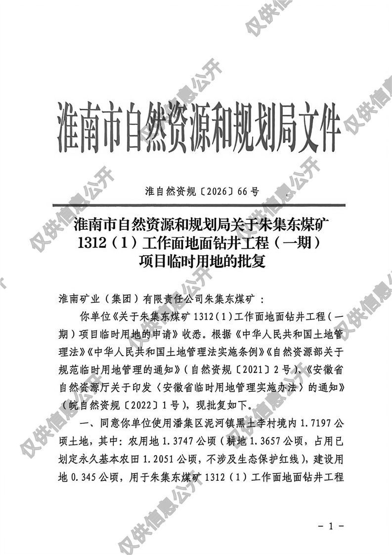 朱集东煤矿1312(1)工作面地面钻井工程(一期)项目临时用地批复