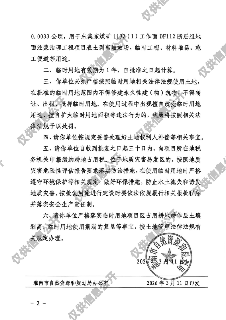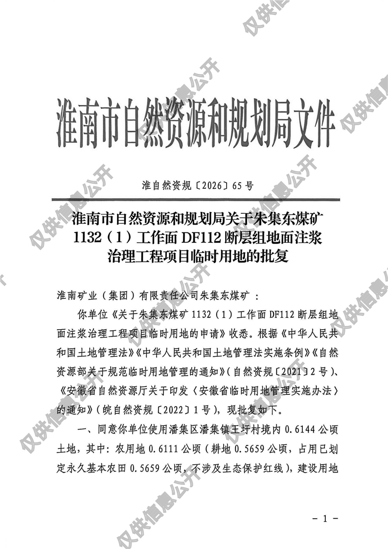 朱集东煤矿1132(1)工作面DF112断层组地面注浆治理工程项目临时用地的批复
