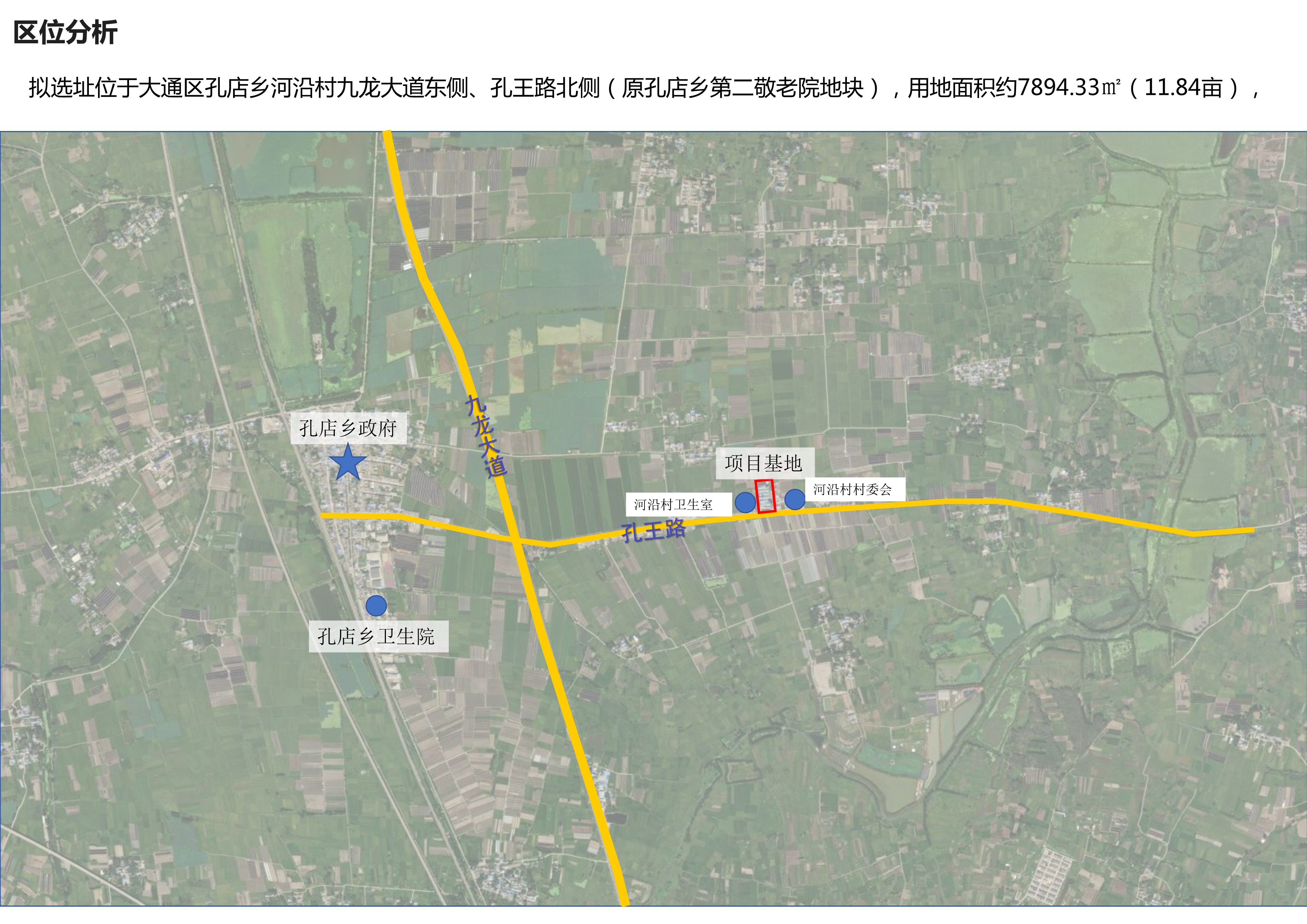 选址位于大通区河沿村孔店乡九龙大道东侧、孔王路北侧(原孔店乡第二敬老院地块),用地面积约7894.33㎡(11.84亩)。