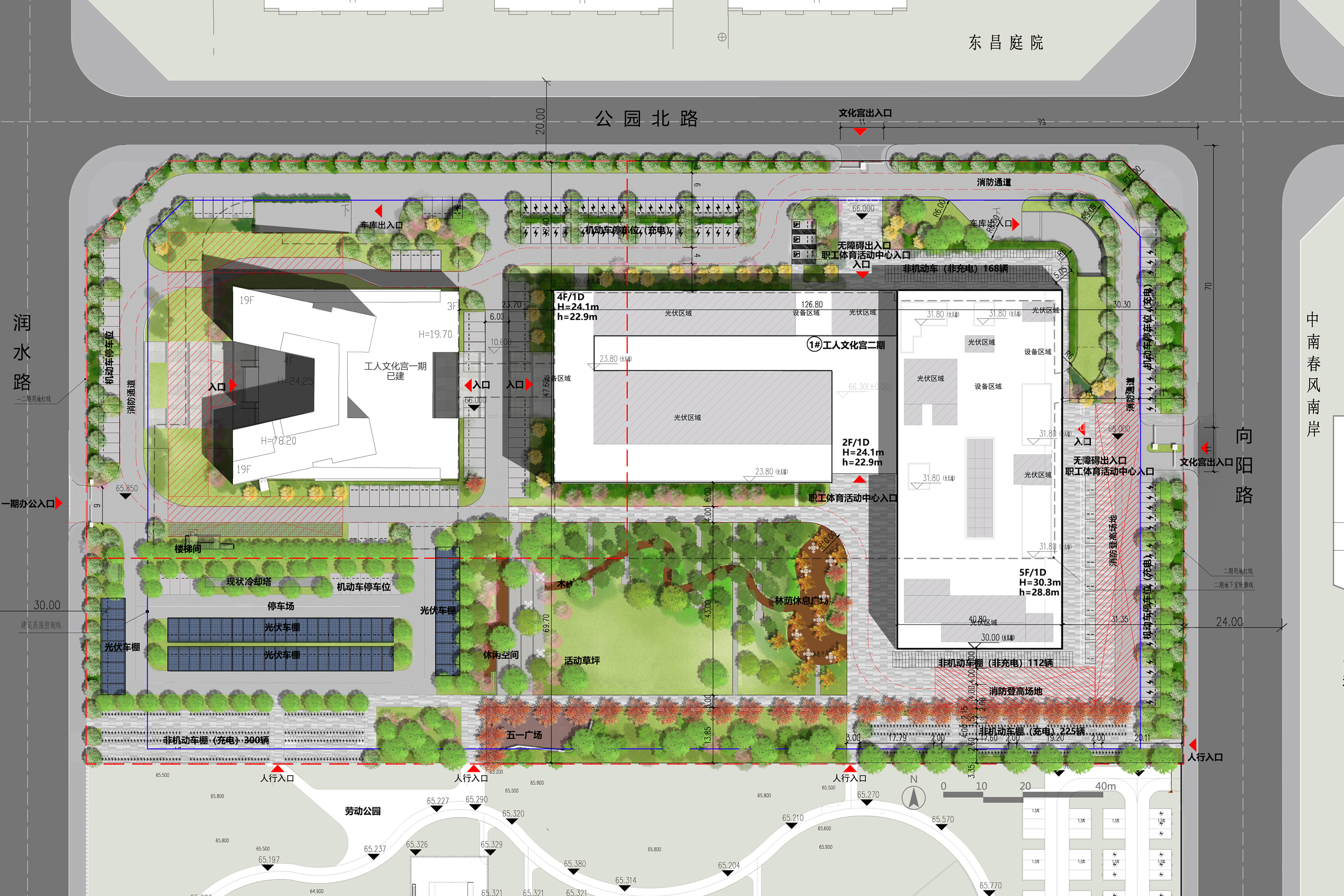 二期项目建筑整体分为两个部分,北侧横向布置的为4层职工体育活动中心,东侧竖向形体为5层的职工公共活动中心及其他职工配套设施。