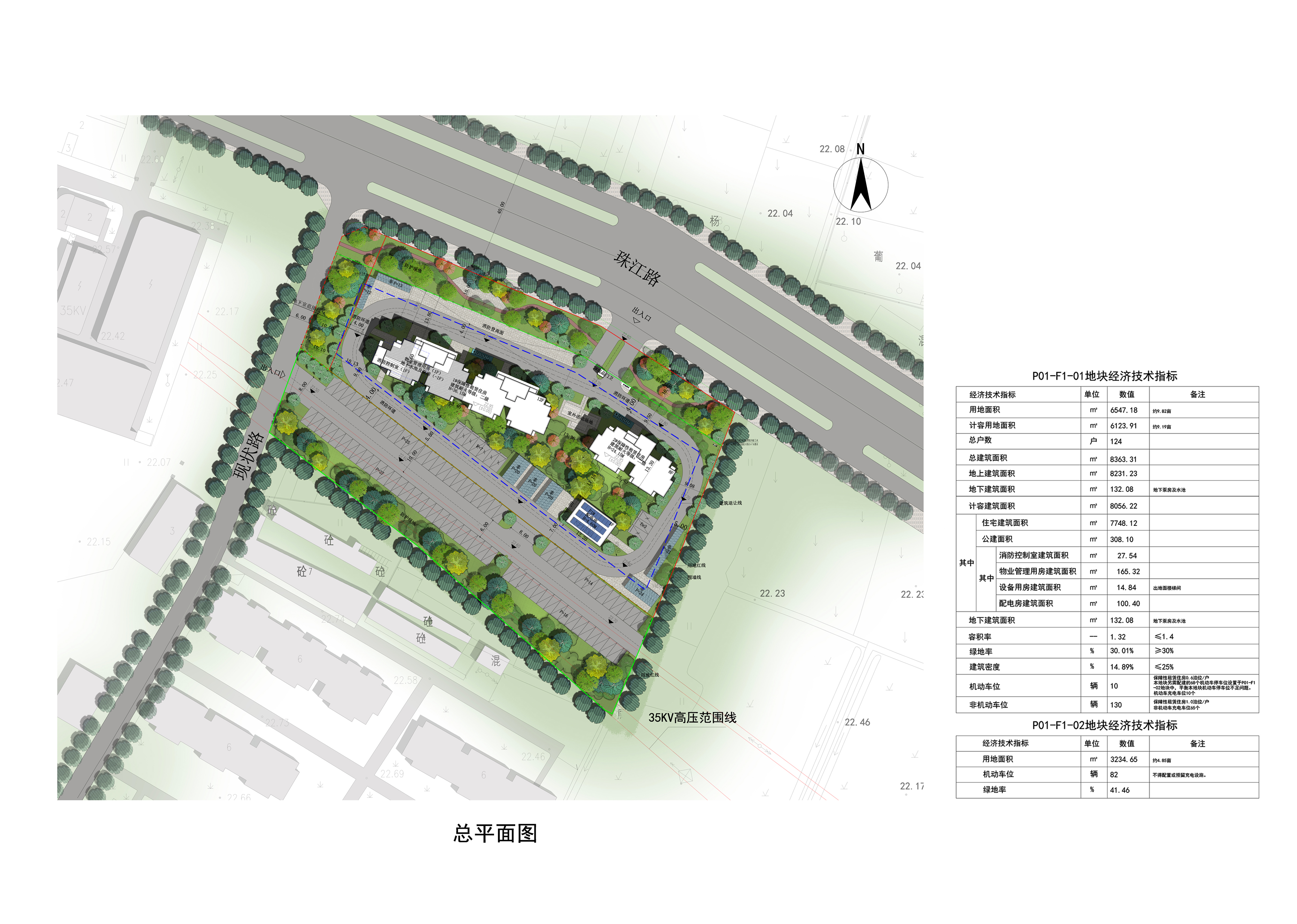 项目地块位于潘集区李玗社区北侧,田集变电站东侧,珠江路南侧。规划总用地面积6547.18㎡,计容用地面积6123.91㎡,总建筑面积8363.31㎡(其中物业管理用房165.32㎡,消防控制室27.54㎡),计容建筑面积8056.22㎡,容积率1.32,建筑密度14.89%,绿地率30.01%,总户数124户。