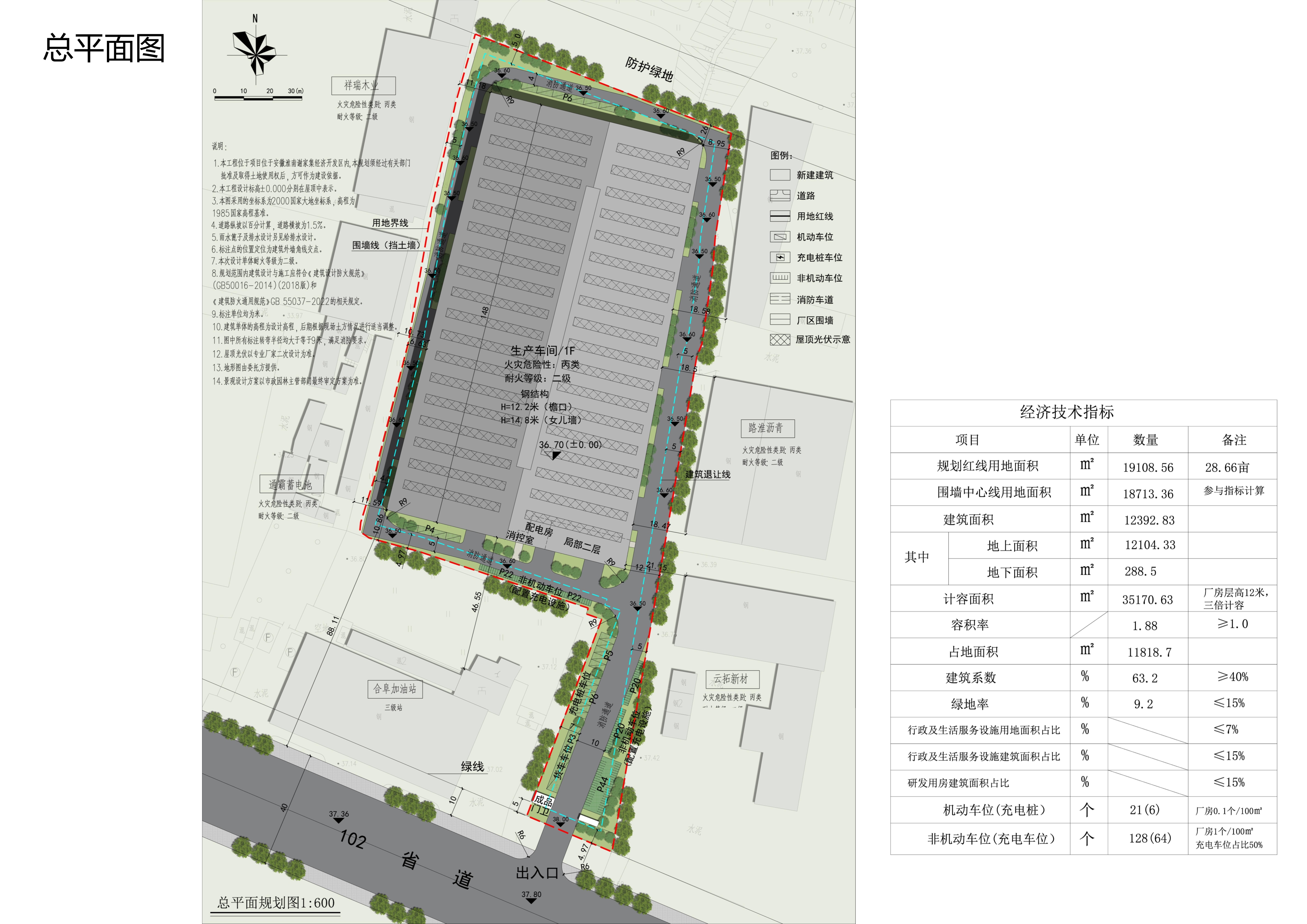 项目地块位于淮南谢家集经济开发区102省道北侧、经五路东侧、李园路西侧,用地面积为19108.56m²。项目规划建设1栋1层(局部2层)厂房(内部设置配电房及地下消防水池)。总建筑面积约1.24万㎡,总计容面积约3.52㎡;容积率1.88,建筑系数63.2%,绿地率9.2%。