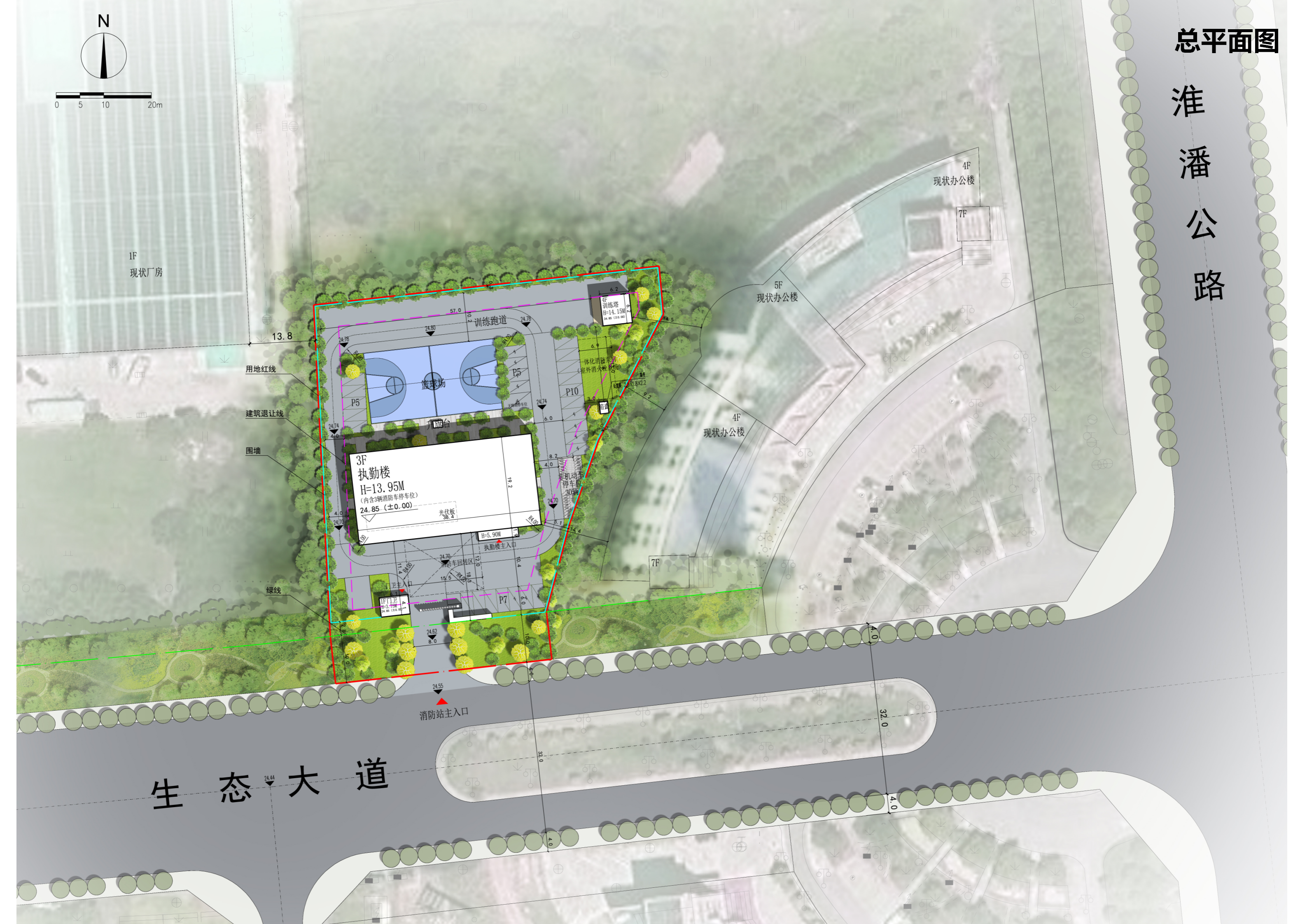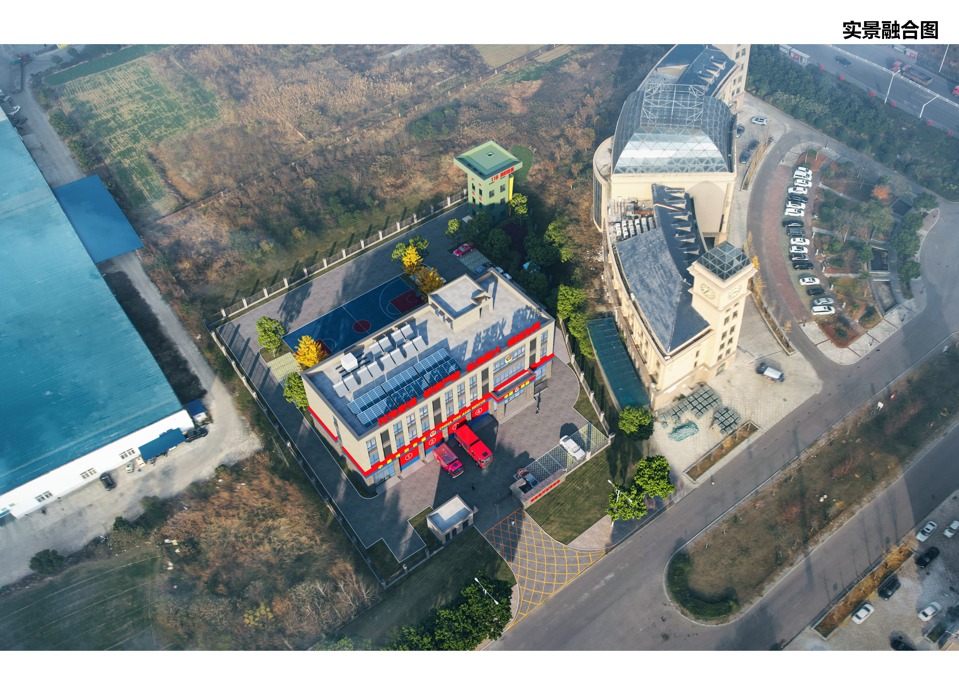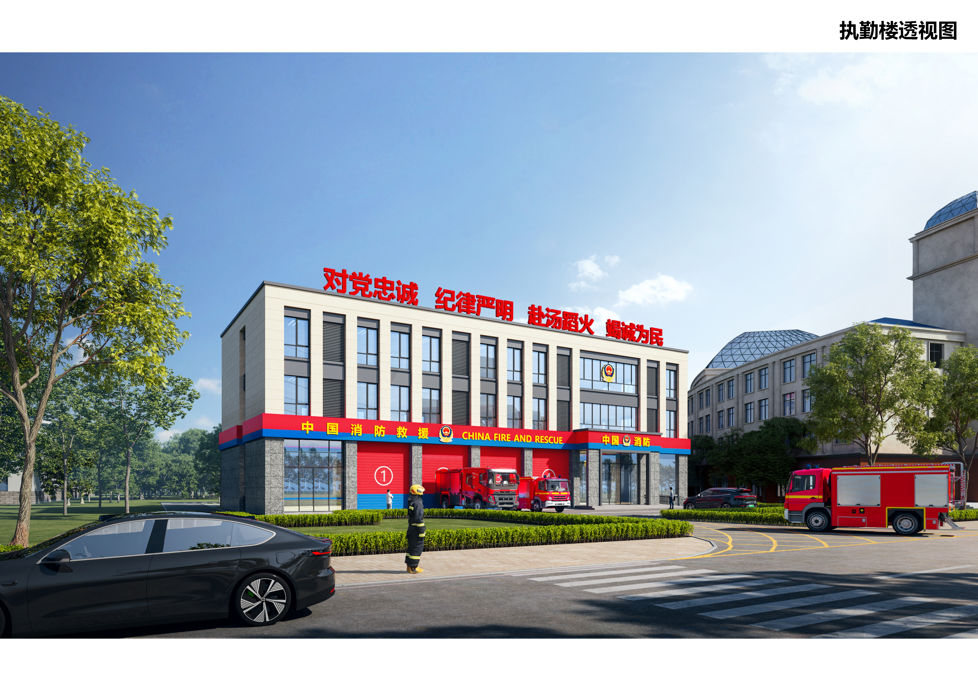 项目地块位于潘集经济开发区淮潘公路西侧、生态大道北侧,总用地面积4619.3㎡,净用地面积4162.7㎡。项目规划新建1栋3层执勤楼、1栋4层训练塔、1栋1层门卫,总建筑面积2439㎡,计容建筑面积2409.08㎡,容积率0.58,建筑密度19.1%,绿地率15%。