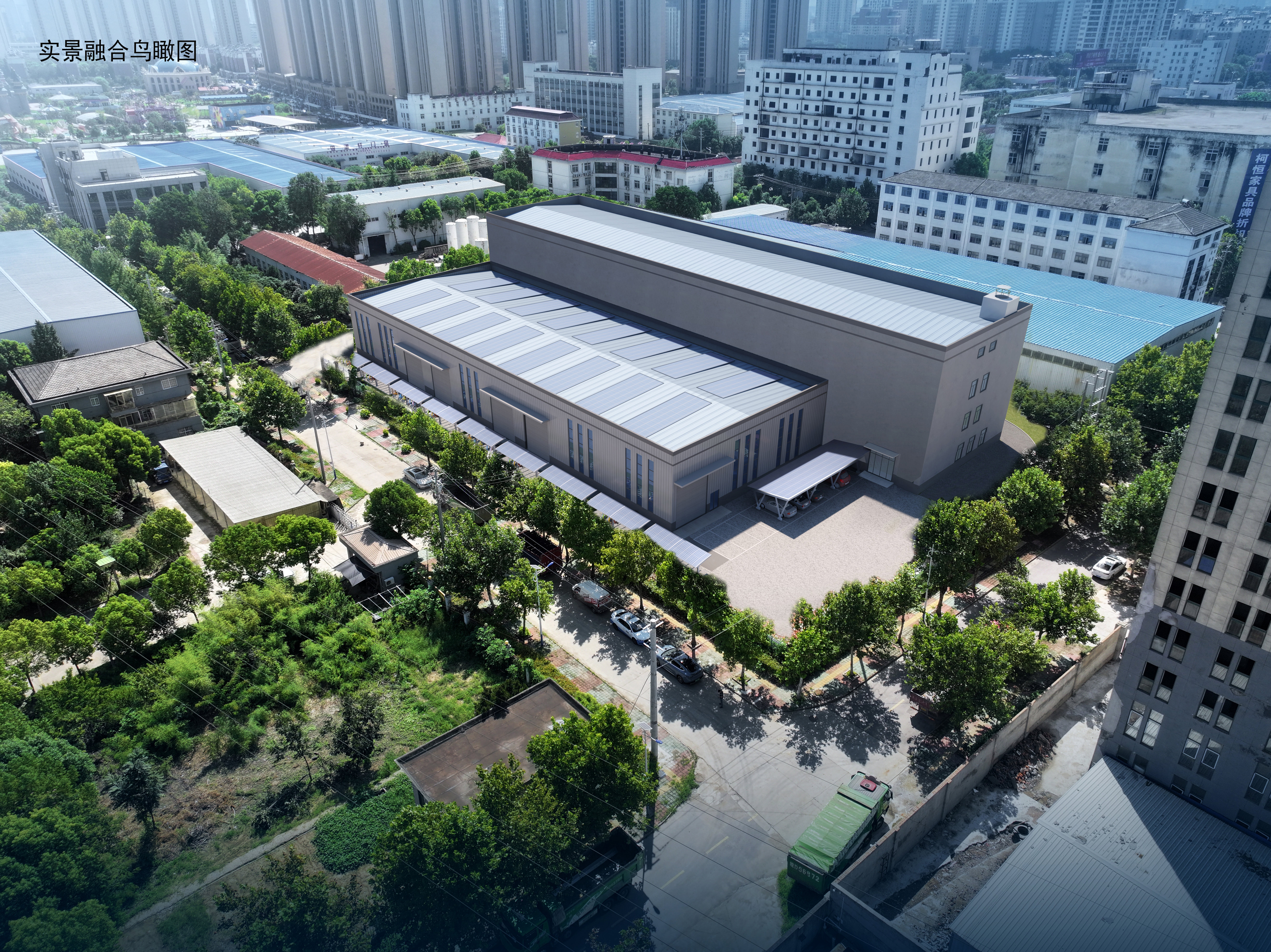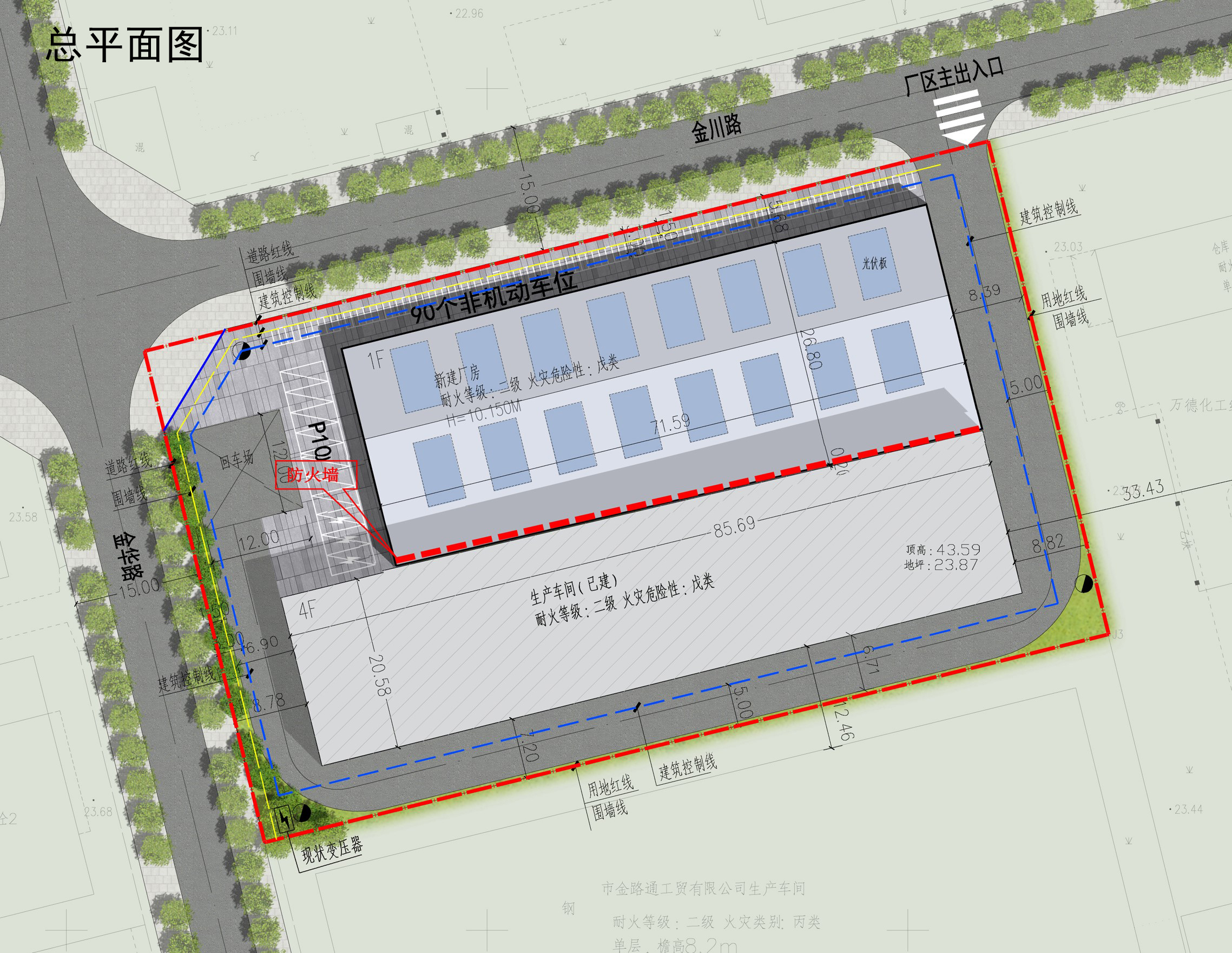 规划设计拟在地块内现状厂房北侧新建1栋1层戊类厂房(中间设置防火墙),总建筑面积8735.73㎡,计容建筑面积 10654.33㎡,新增建筑面积1918.6㎡,新增计容建筑面积3837.2㎡。厂区容积率1.79,建筑系数61.8%,绿地率2.6%。