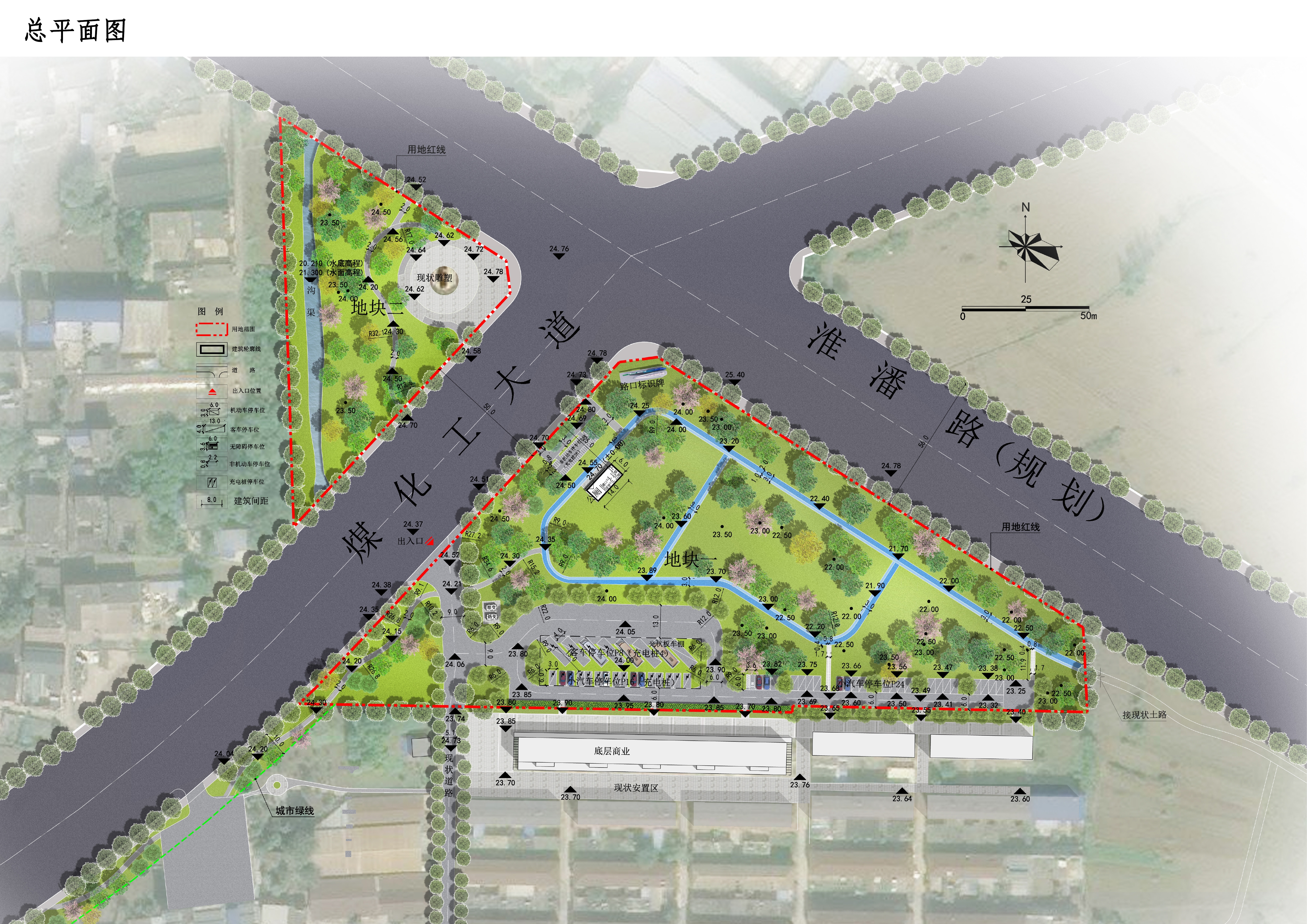 地块二位于煤化工大道北侧,淮潘路南侧。总用地面积7649.40㎡,绿地率66%。