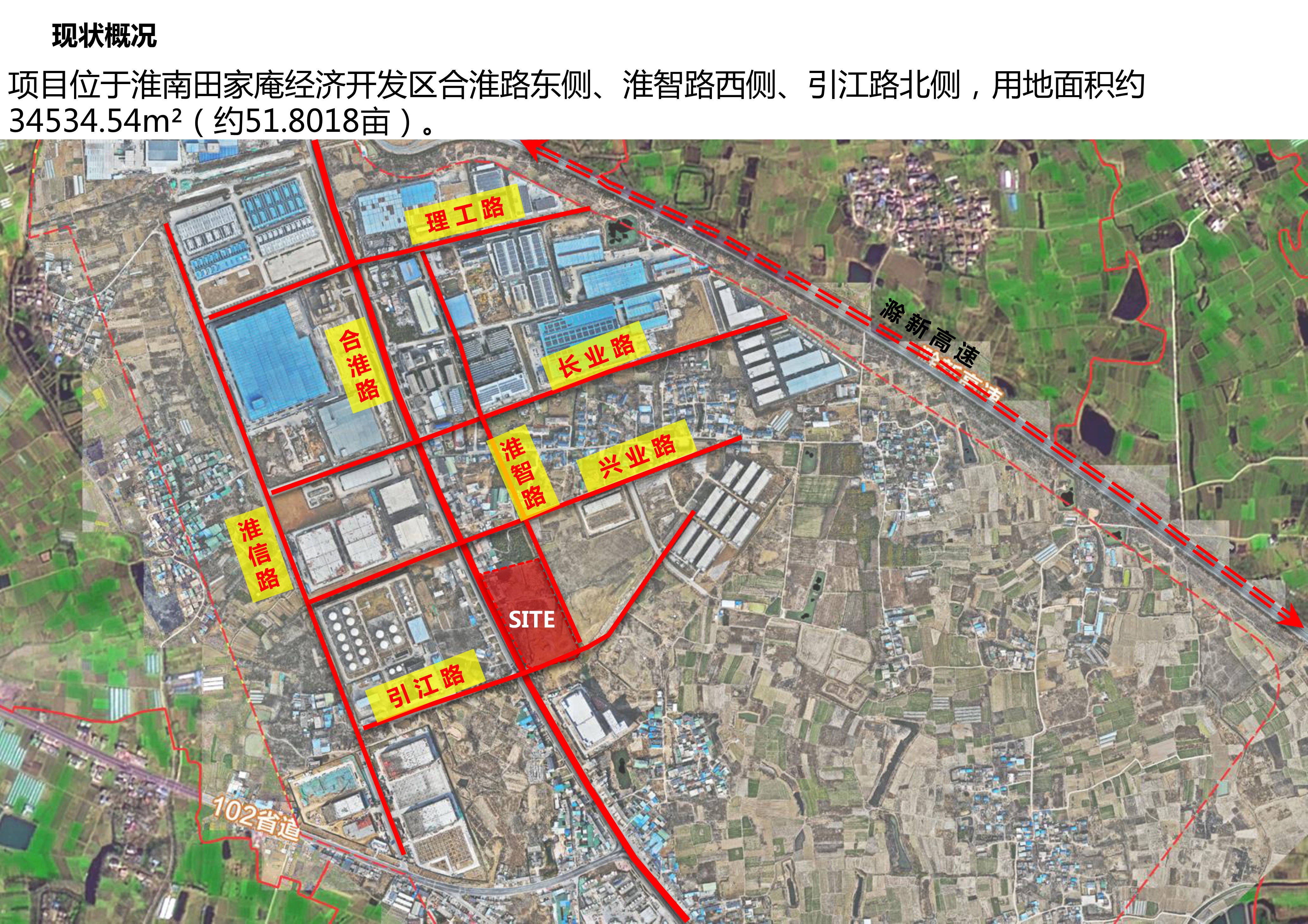 项目地块位于淮南田家庵经济开发区合淮路东侧、淮智路西侧、引江路北侧,用地面积为34534.54 m²,项目规划建设1栋4层综合楼、1栋2层冷库、2栋3层厂房、1栋1层垃圾房、1栋1层配电房、1栋1层机修房、洗衣房及地下消防泵房水池等。总建筑面积47986.04㎡,总计容面积52016.04㎡,容积率1.53,建筑系数49.09%,绿地率4.17%。