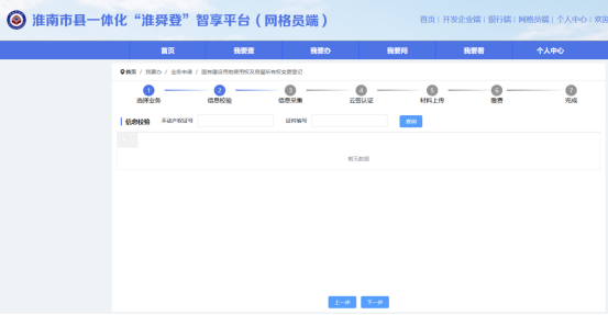 2.登陆后在业务申请里选择“变更登记”。个人端可直接获取房源信息。网格员端录入不动产权证号、证件号码(权利人身份证号)后,点击“下一步”。
