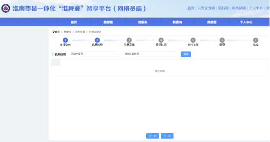 2、个人端登录,可直接选择“我要补证”选项,“网格员”在业务申请里选择其他登记-补发证登记,“个人端”可直接获取房源信息。“网格员端”录入不动产权证号、(权利人证件号后获取需要办理业务信息,点击下一步。